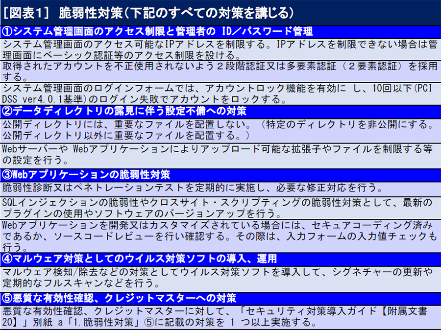 新GLは求められる脆弱性対策が何であるかも具体的に示した(図表1)。より詳しい内容は、新GLと同時に改定された附属文書20「EC加盟店におけるセキュリティ対策導入ガイド2.0版」(以下、付属文書20)に紹介されている。