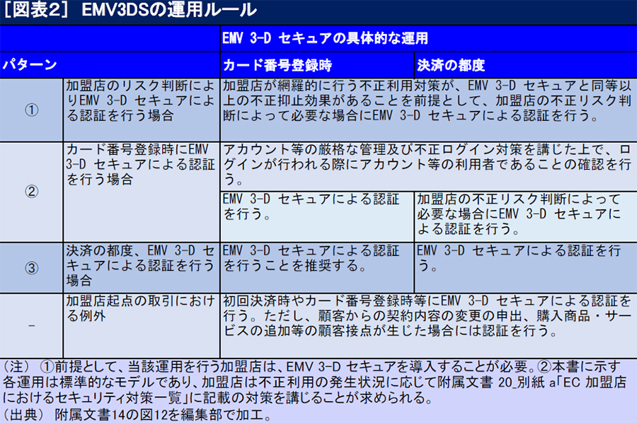 また、EMV 3.D セキュアの未導入が認められる取引についても別途定めている」(38ページ)と柔軟な枠組みを提示した。