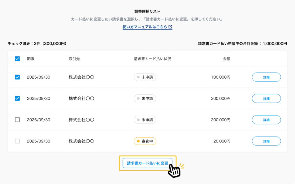 改善の必要性を感じた場合は、入出金シミュレーションのボタンを押し、対象年月や出金を遅らせたい金額を入力することで、将来のキャッシュフローがどう変わるかを確認することができる。このシミュレーションは、出金を遅らせたい年月と金額を指定して、画面上の実行ボタン押すだけで使える。 出金を遅らせる必要があると分かった場合は、調整対象リストから対象の支払を選択し、「請求書カード払いに変更」のボタンを押せば(画像2)、請求書カード払いサービスを利用できる。請求書の支払期限や請求書カード払いを申し込んだタイミングにもよるが、40日程度支払を遅らせることができるという。