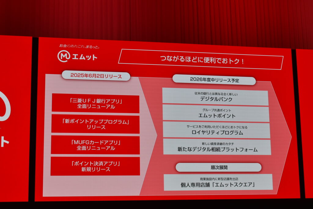 グループ共通ポイントとして、三菱UFJニコスのカードポイント基盤を改良し、「エムットポイント」を26年度中にリリースする。エムットポイントはCOIN+の残高に交換できるようにする。COIN+の残高は手数料無料で銀行口座に送金できる。
