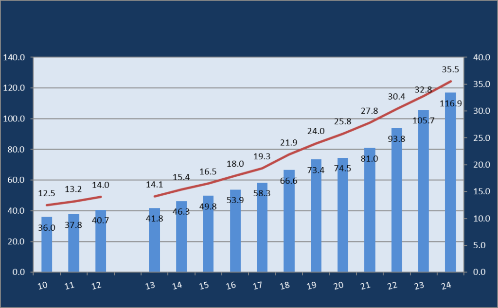 日本クレジット協会の「日本のクレジット統計2024年版」における市場規模統計(年次統計)によると、24年(暦年)のクレジットカードの新規供与額(取扱高・決済額)は116兆8924億円だった。前年比10.6%増と2桁の伸長率を維持しており、高い水準で安定的な成長を続けている(図表1)。