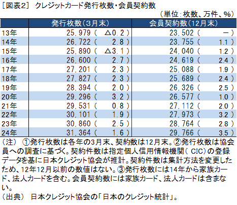 (注) カード決済比率は民間最終消費支出(名目暦年)に対するクレジットカードショッピング取扱高(暦年)の比率。カードショッピング取扱高については、13年に集計方法の見直しを行ったため、以前の数値との連続性はない。民間最終消費支出については、25年6月9日公表の25年1-3月期2次速報値に基づく。なお、16年に国民経済計算の作成基準が改定されている。