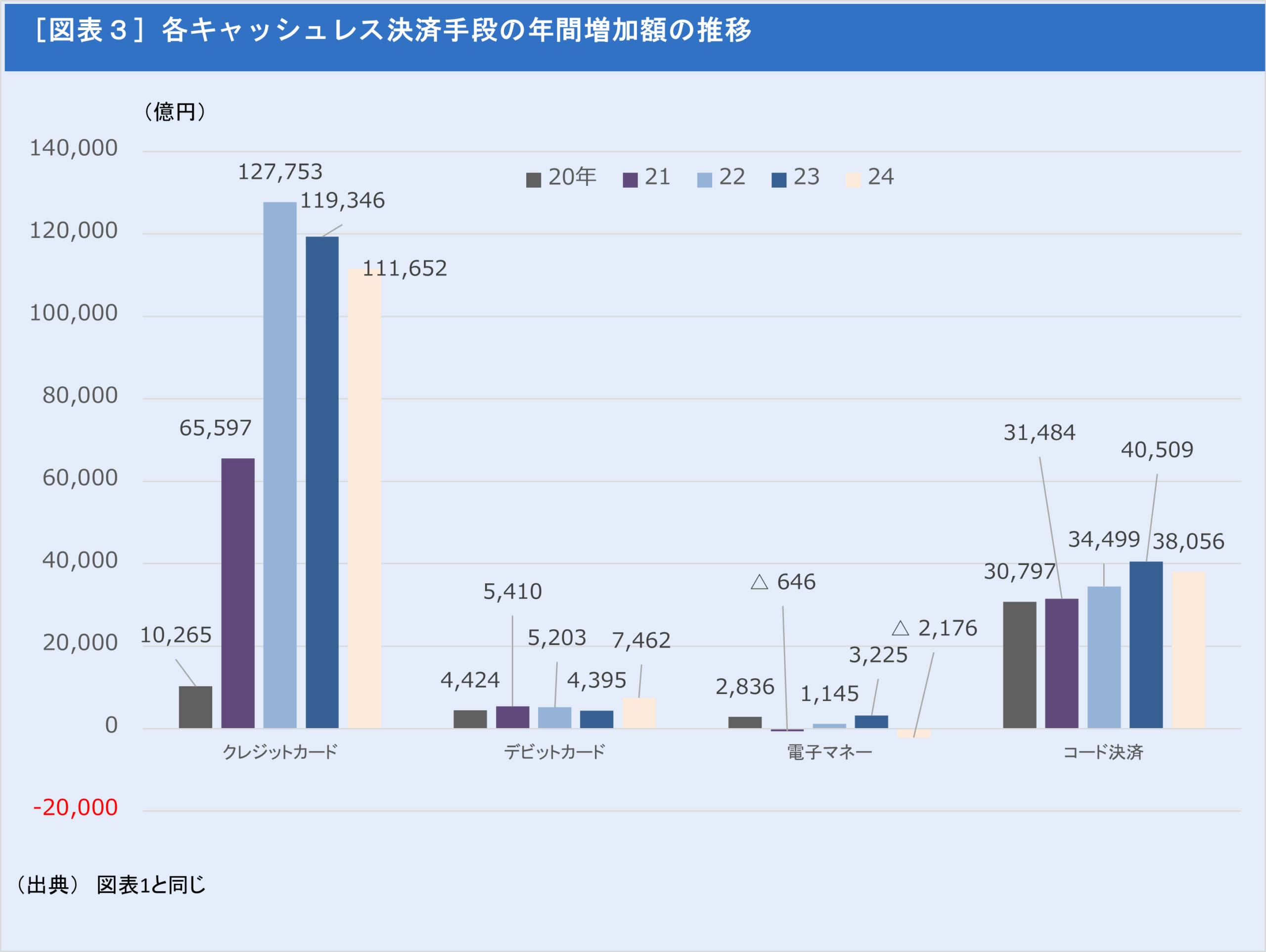 22年から24年までの3年間、クレジットカードの増加額は11~12兆円で推移。3~4兆円台で推移するコード決済の3倍程度の増加額を維持してきた。
