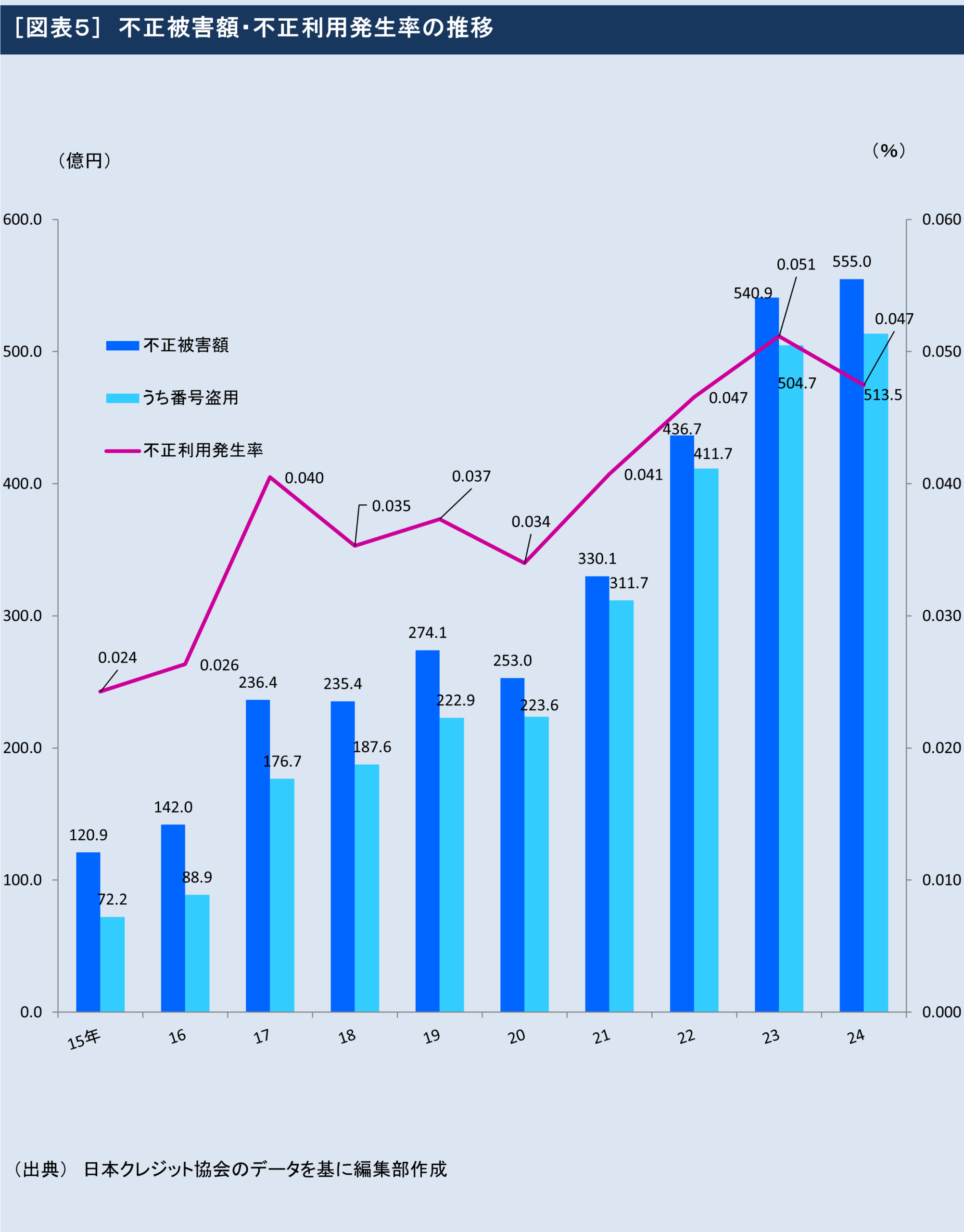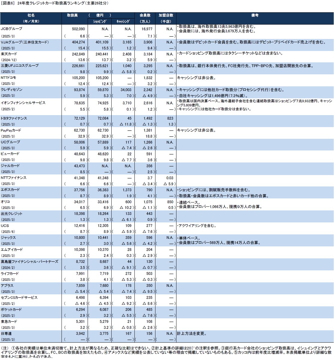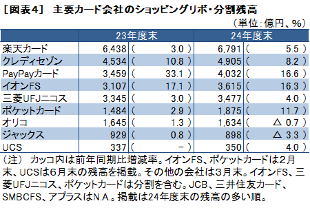 その他、図表4に主要各社のリボ・分割残高を、図表5にクレジットカードの不正利用の推移を、図表5に主要企業のカード取扱高ランキングを示した。