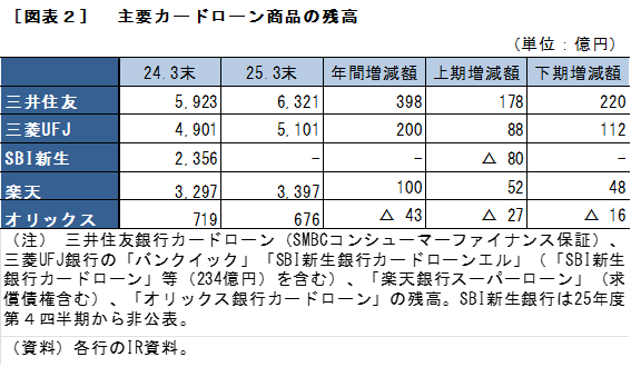 ただ、図表2を見ると、三井住友カードや三菱UFJ銀行はカードローン残高をそれぞれ6.7%、4.1%増加させており、ネット銀行よりも強い成長を示した。